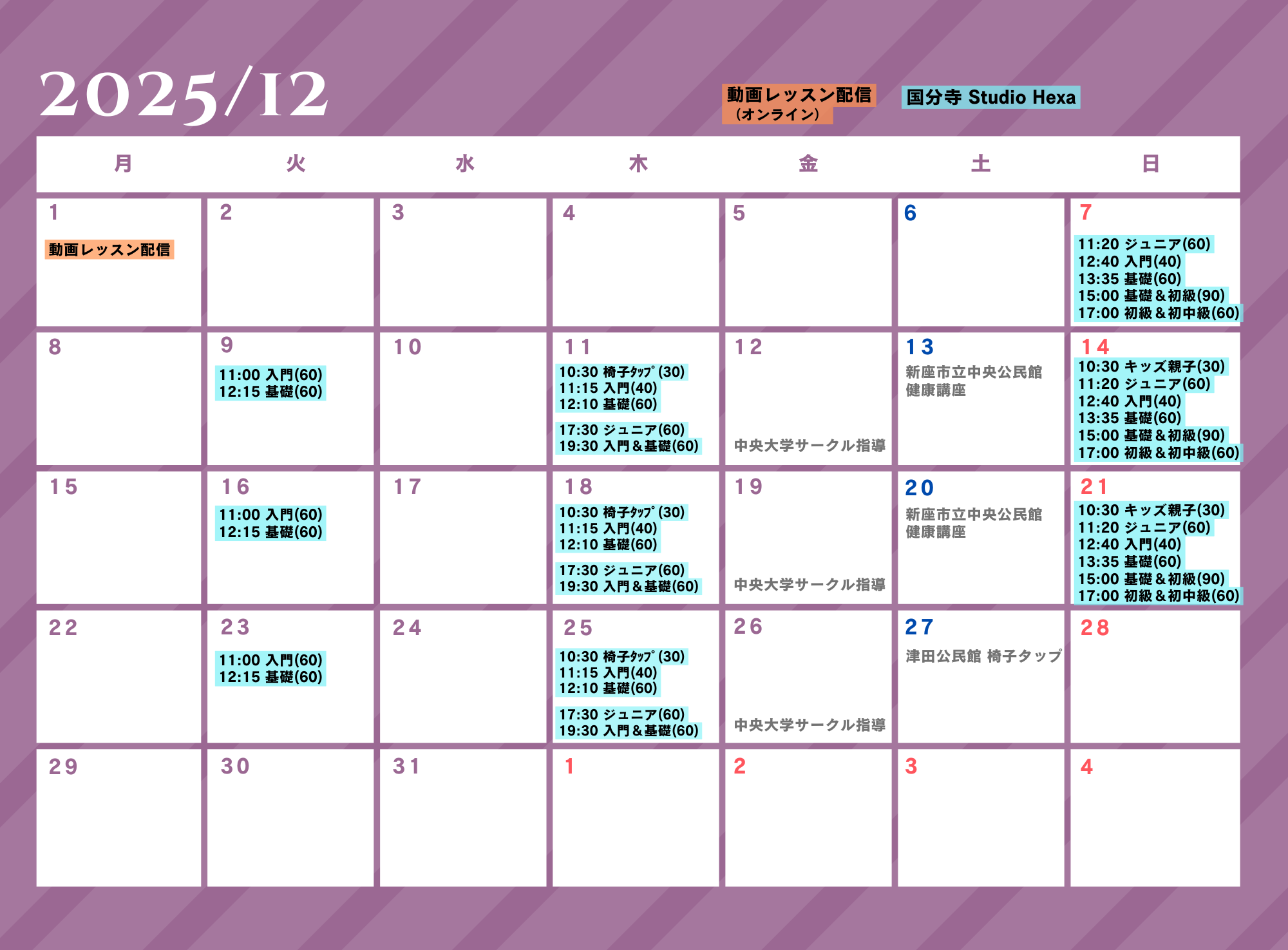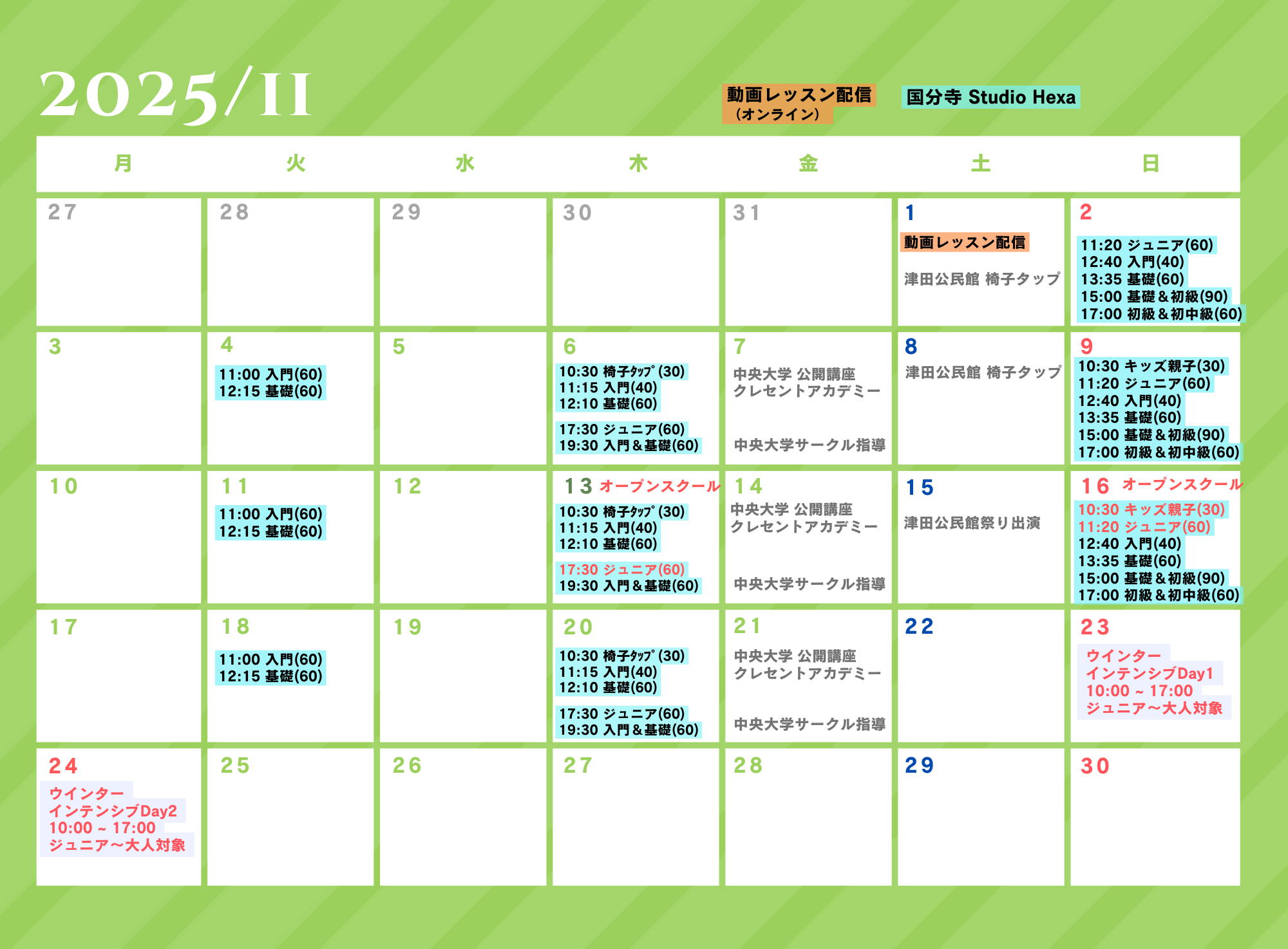 10:30 椅子タップ(30分) ★ 11:15 入門(40分) ★ 12:10 基礎(60分) 17:30 ジュニア(60分) ★ 19:30 入門&基礎(60分) |